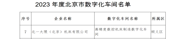 北一大隈(北京)机床有限公司获评为2023年度北京市数字化车间