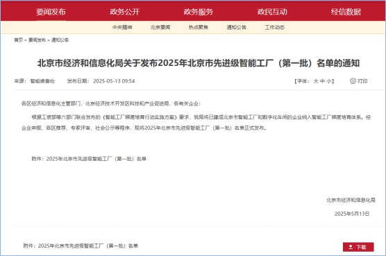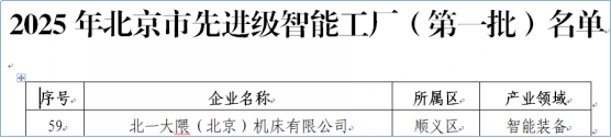 2025年5月13日,北京市经济和信息化局根据工信部等六部门联合发布的《智能工厂梯度培育行动实施方案》要求,将已建成北京市智能工厂和数字化车间的企业纳入智能工厂梯度培育体系, 公布了115家北京市先进级智能工厂(第一批)企业名单,北一大隈(北京)机床有限公司成功入选其中。
